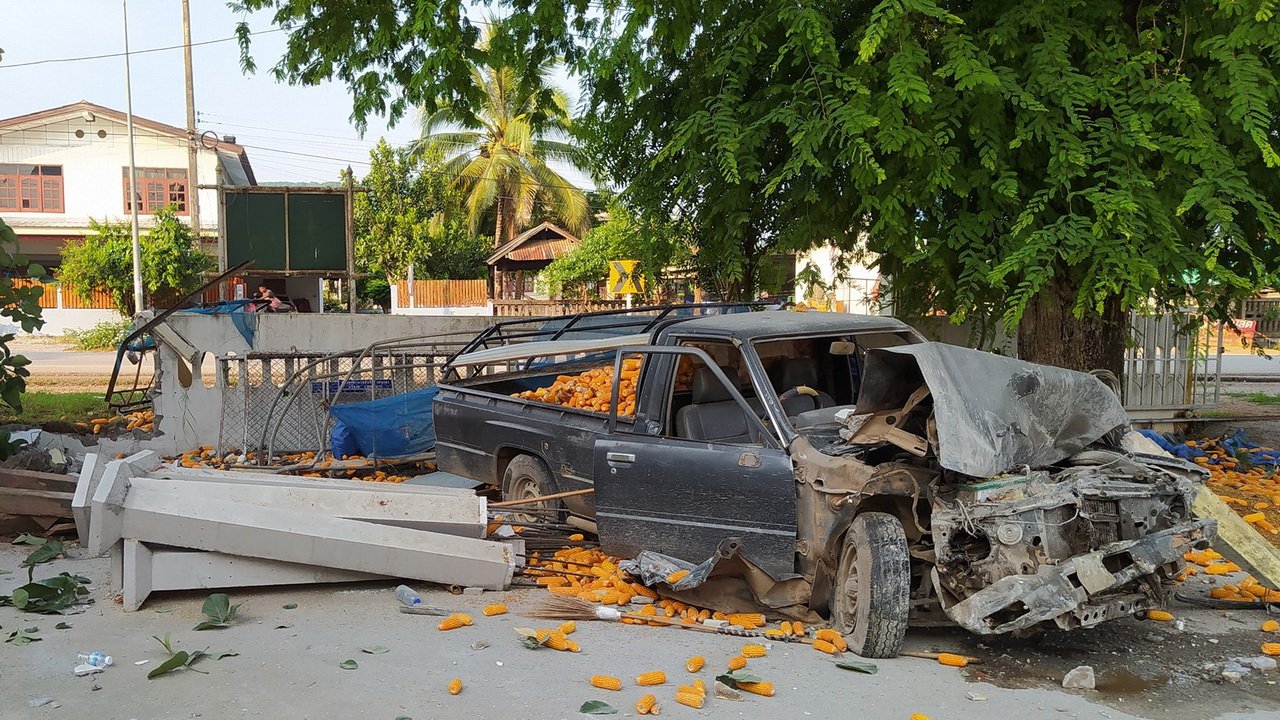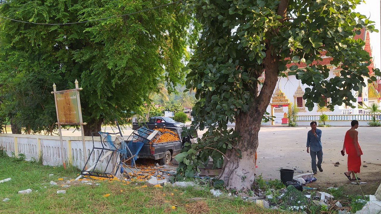 กระบะหลับในชนกำแพงวัดทะลุ พระในวัดฉันข้าวอยู่ตกใจเสียงตูมออกมาดู พบกระบะชนทะลุกำแพง บอกไม่เป็นไรกำลังรื้อกำแพงวัดสร้างใหม่