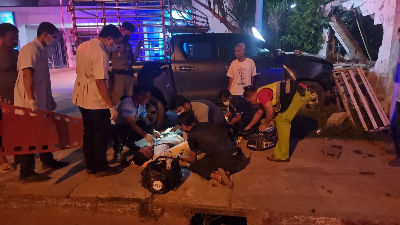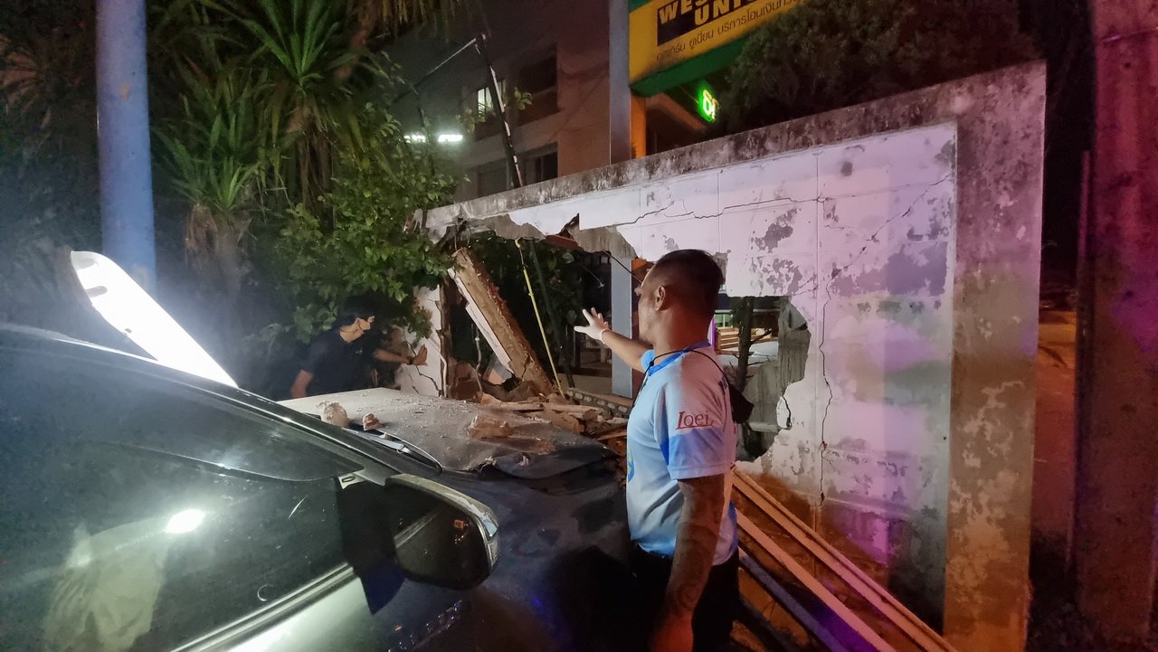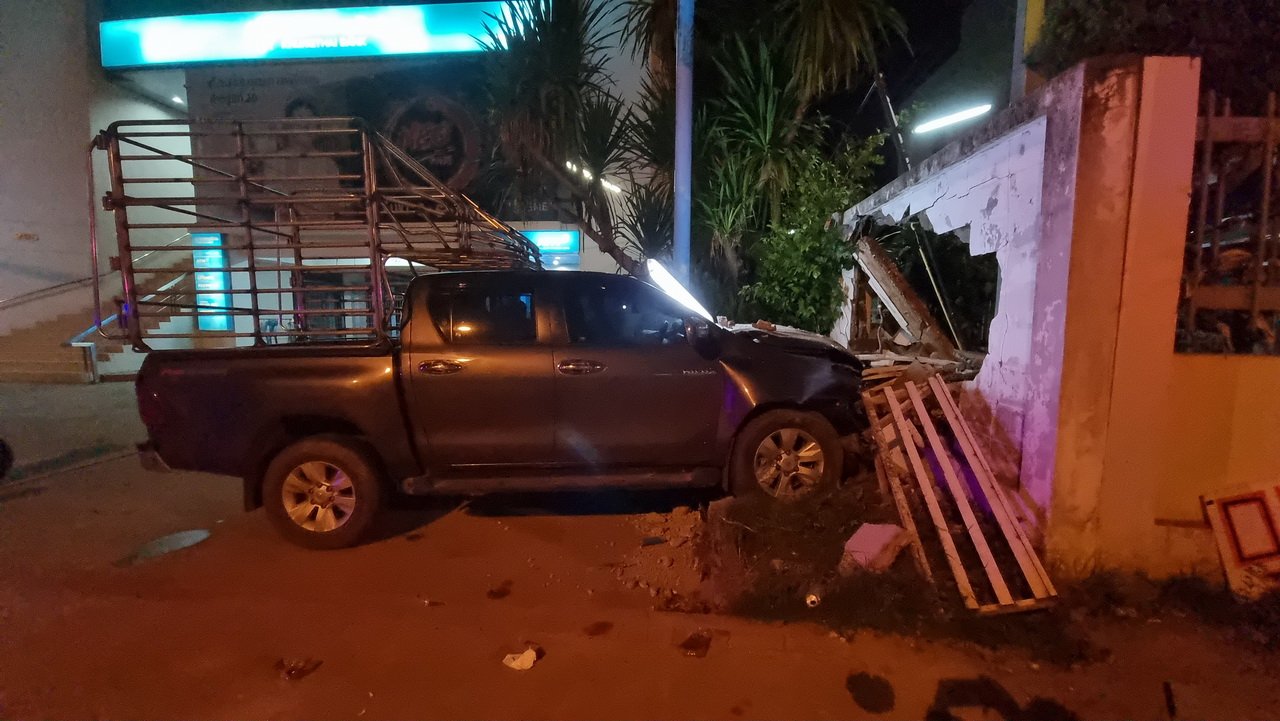 หนุ่มวัย 24 ปี ขับกระบะวีโก้กลับบ้าน เสียหลักพุ่งชนกำแพงปูนแบงก์กรุงไทยทะละ ส่วนคนขับเจ็บสาหัส
