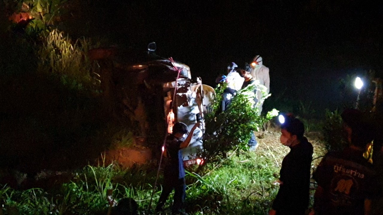 หนุ่มช่างติดตั้งจานดาวเทียว ขับกระบะกลับบ้าน เกิดฝนตกรถเสียหลักพลิกคว่ำลงไหล่ทางลึก 40 เมตร ทับคนขับดับ ส่วนผู้โดยสารเจ็บ