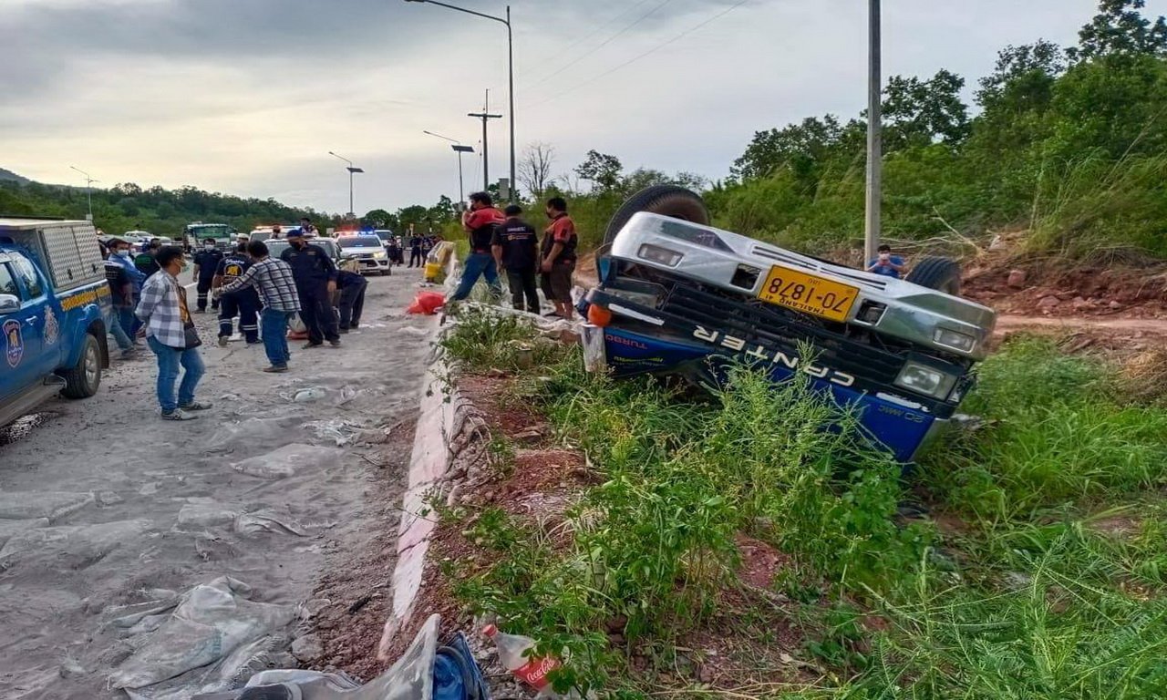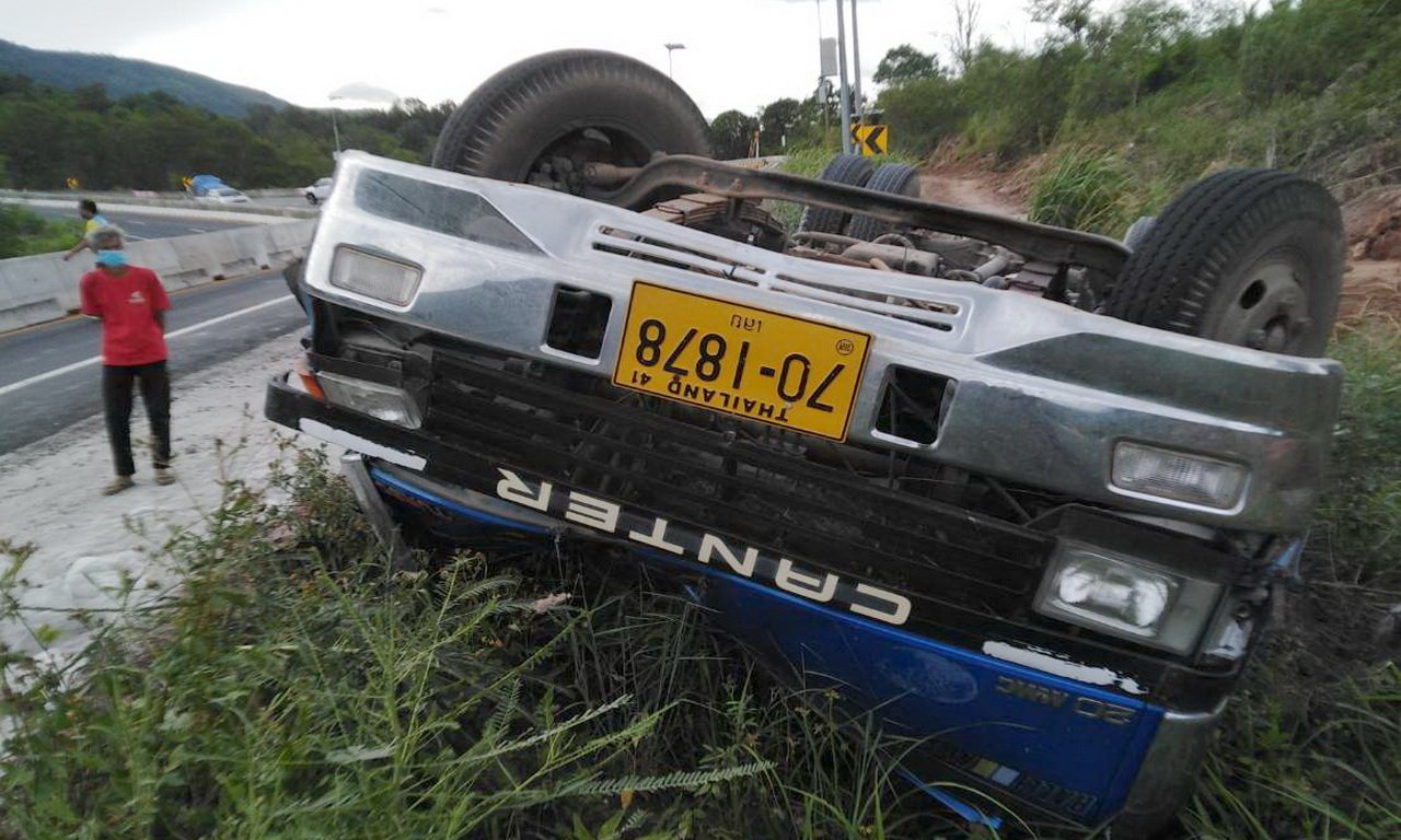 สองพ่อลูกขับรถหกล้อสไลด์ไปส่งปูนซิเมนต์บ้านลูกค้า ลงเขาโค้ง 100 ศพ อ.วังสะพุง เสียหลักชนแท่งปูนแบรีเออร์ พลิกคว่ำล้อชี้ฟ้าทับร่างสองพ่อลูกดับคารถ