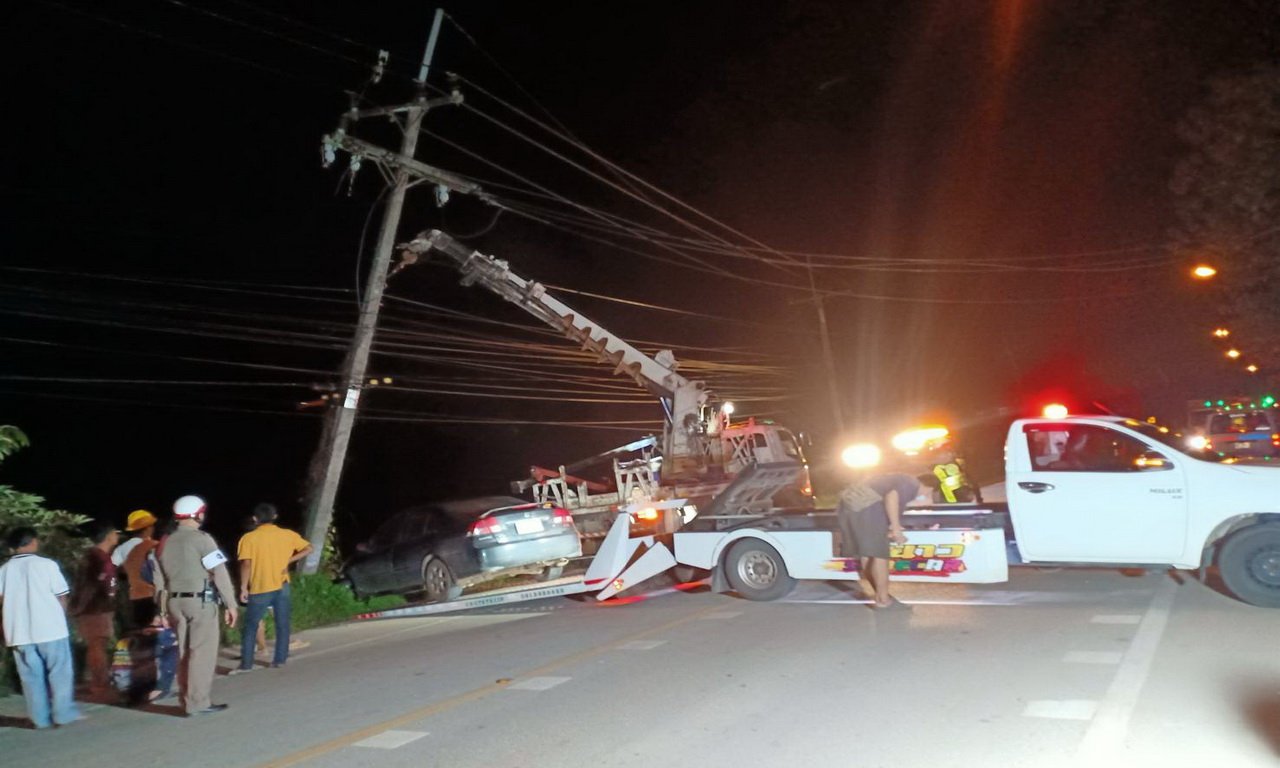 เก๋งฮอนด้า ชนเสาไฟฟ้าหัก ตำรวจ กู้ภัยฯ ไปที่เกิดเหตุ คนขับหาย แถมกุญแจรถก็ไม่อยู่