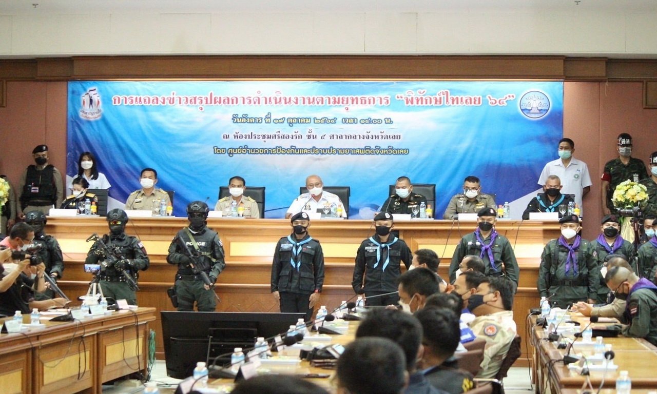 นายชัยธวัช เนียมศิริ ผู้ว่าราชการจังหวัดเลย กล่าวว่า จังหวัดเลยได้กำหนดแนวทางและเป้าหมายเน้นหนักการดำเนินการป้องกันและแก้ไขปัญหายาเสพติดโดยขยายผลการจับกุม และยึดทรัพย์สินที่ได้มาจากการเกี่ยวข้องกับยาเสพติด ดำเนินการเสริมสร้างความเข้มแข็งของหมู่บ้าน ชุมชนโดยใช้กลไกคณะกรรมการหมู่บ้านหรือคณะกรรมการชุมชน นำผู้เสพยาเสพติดที่ผ่านการประชาคมลับที่เหลือจากการบำบัดในศูนย์ปรับเปลี่ยนพฤติกรรม เข้ารับการบำบัดรักษาในสถานพยาบาลใกล้บ้าน โรงพยาบาลส่งเสริมสุขภาพประจำตำบลทุกราย ซึ่งจากห้วงเวลาตั้งแต่เปิดยุทธการจนถึงวันที่ 30 กันยายน 2564 มีผลการปฏิบัติงานเป็นที่น่าพอใจในทุก ๆ ด้าน ตามที่ได้กำหนดไว้เป็นแนวทางการขับเคลื่อนภายใต้ยุทธการ “พิทักษ์ไทเลย 64” ได้แก่ ด้านการปราบปรามและบังคับใช้กฎหมาย มีการจับกุมผู้ค้ายาเสพติดในพื้นที่ โดยการขยายผลการจับกุม และยึดทรัพย์ที่ได้มาจากการเกี่ยวข้องกับยาเสพติดไปแล้ว 3,671 คดี ผู้ต้องหา จำนวน 3,709 คน มูลค่าทรัพย์สิน 17,454,241 บาท กำหนดแนวทางการสกัดกั้นการลักลอบขนยาเสพติดตามแนวชายแดน เพื่อให้หน่วยงานที่มีหน้าที่รับผิดชอบตามแนวชายแดน ประกอบด้วย ศูนย์ปฏิบัติการป้องกันและปราบปรามยาเสพติดอำเภอ กรมทหารพราน ที่ 21 ตำรวจภูธร ตำรวจตระเวนชายแดน สถานีเรือเชียงคาน ตำรวจน้ำเชียงคาน และกองกำลังภาคประชาชน ชุดรักษาความปลอดภัยหมู่บ้าน ดำเนินการตั้งจุดตรวจ จุดสกัด การปฏิบัติการด้านการข่าว การเฝ้าระวังตามแนวชายแดน การลาดตระเวน และการตั้งจุดตรวจภายในหมู่บ้าน และกำหนดพื้นที่รับผิดชอบอย่างชัดเจนตามแนวชายแดนทั้ง 199 กิโลเมตร