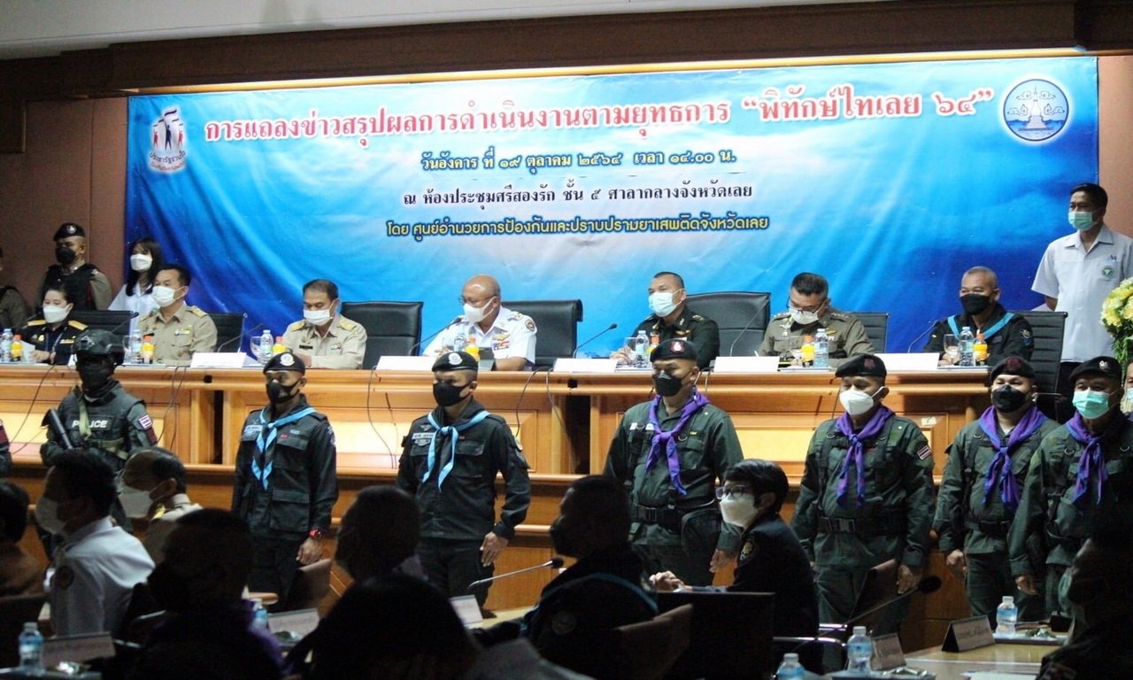 เวลา 14.00 น. วันที่ 19 ต.ค.64 ที่ห้องประชุมศรีสองรัก ชั้น 5 ศาลากลางจังหวัดเลย นายชัยธวัช เนียมศิริ ผู้ว่าราชการจังหวัดเลย เป็นประธานแถลงข่าวสรุปผลการดำเนินงานตามยุทธการ “พิทักษ์ไทเลย 64” โดยมี พ.อ.สมหมาย บุษบา รอง ผบ.มทบ.28/รอง ผอ.รมน.จังหวัดเลย (ท.) พ.ต.อ.ยุทธวัฒน์ โชคชัย รอง ผบก.ภ.จว.เลย ร.อ.สมนึก มัญจกาเภท แทนผู้บัญชาการกองกำลังสุรศักดิ์มนตรี นายแพทย์ชาญชัย บุญอยู่ นายแพทย์สาธารณสุขจังหวัดเลย นายเฉลิมชัย แสนมหาชัย ศึกษาธิการจังหวัดเลย นางอรนุช สังขวรรณะ แทนผู้อำนวยการสำนักงานป้องกันและปราบปรามยาเสพติด ภาค 4 ร่วมแถลงข่าว