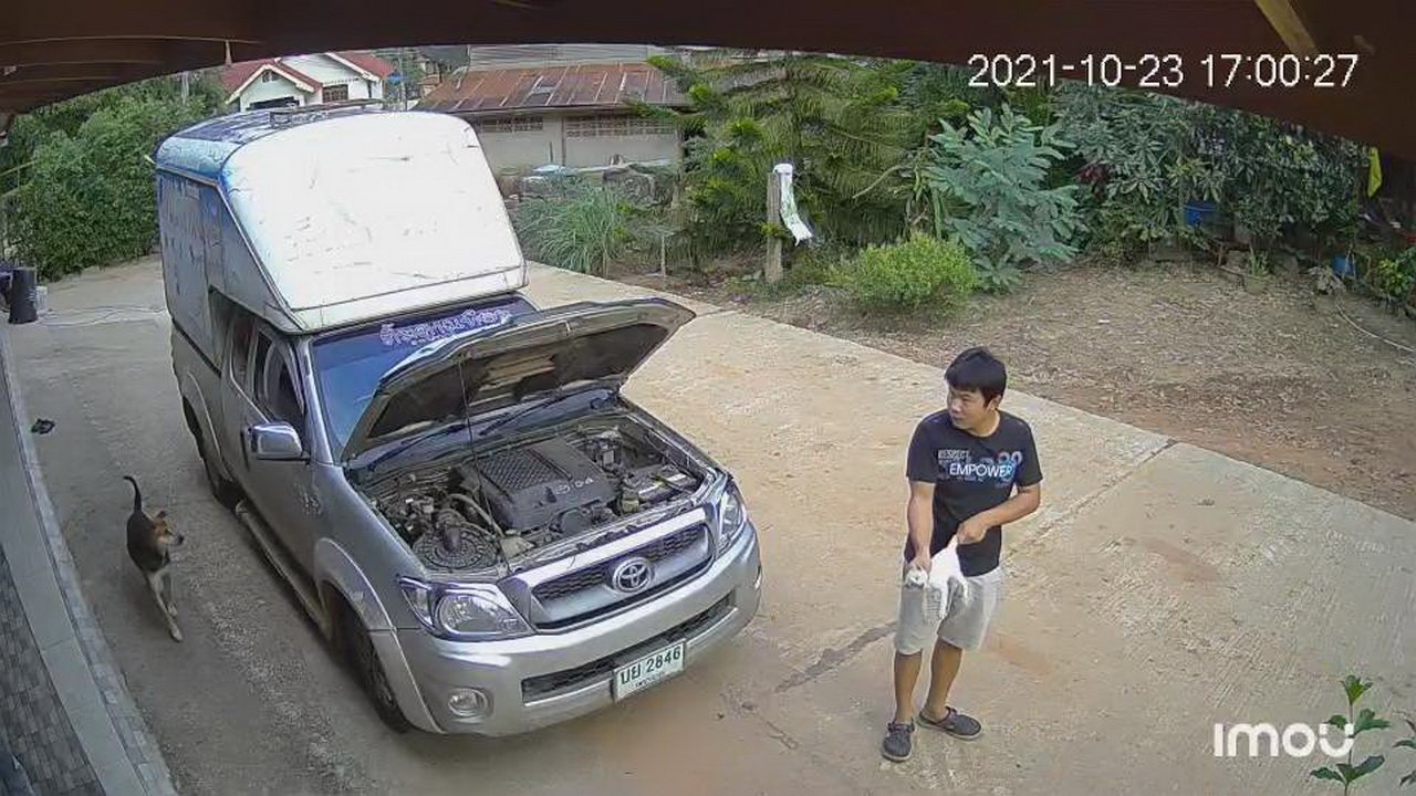 วันที่ 24 ต.ค.64 นายพรหมพิราม วังคีรี อายุ 35 ปี โพสต์กล้องวงจรปิดในเฟสบุ๊กว่า ขับรถกระบะกลับบ้าน เปิดฝากระโปรงรถ ต้องตกใจเมื่อเจอลูกแมวร้อง รีบช่วยออกมา โชคดีที่ลูกแมวไม่ตาย แค่ตกใจ