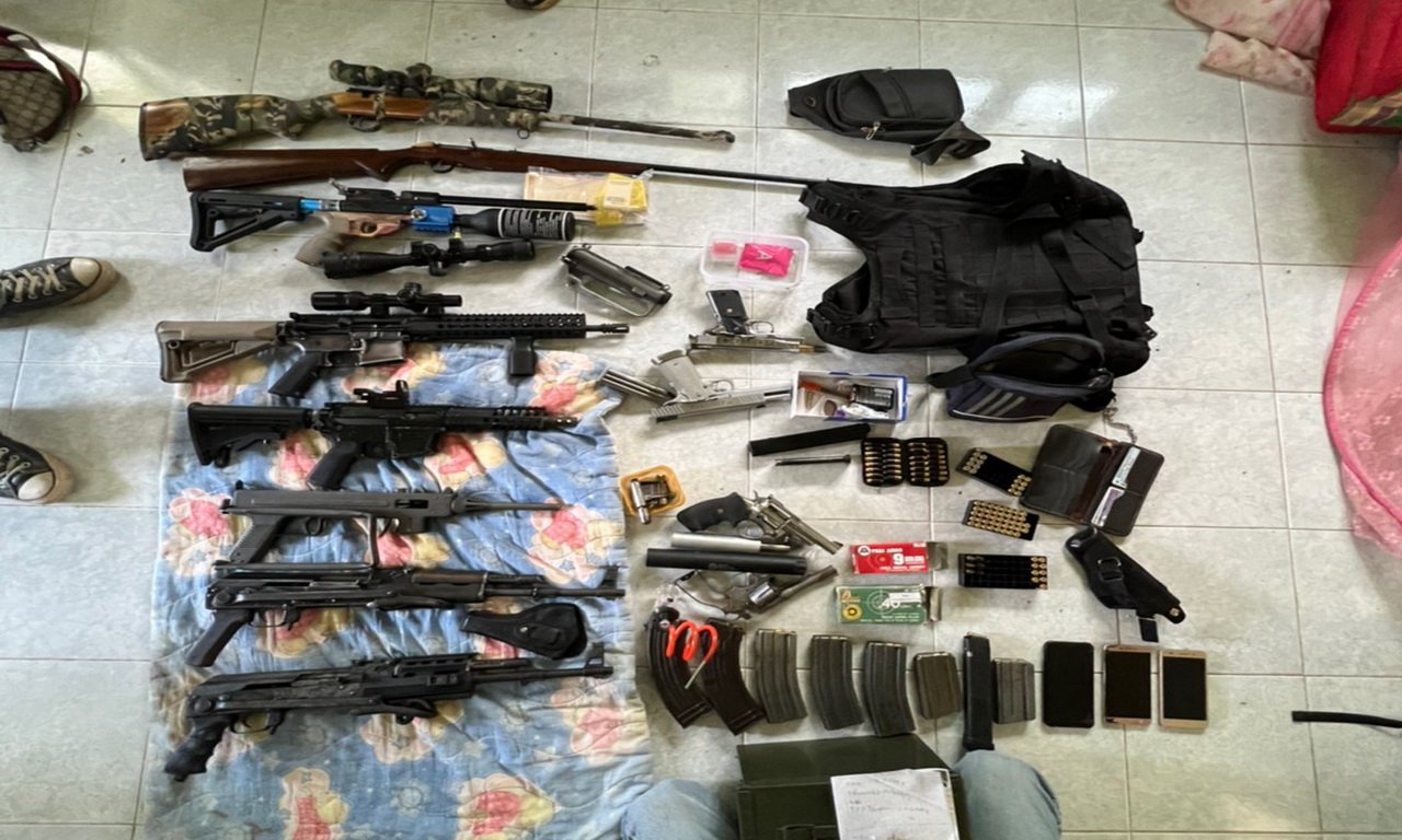 เมื่อเวลา 11.00 น. วันที่ 27 ต.ค.64 พ.ต.ท.ณัทญา ทองจันทร์ ผกก.สภ.เอราวัณ พ.ต.ท.อุดม เป็งนวล รอง ผกก.สส.ฯ พ.ต.ท.จิรัสย์ แสนประสิทธิ์ รอง ผกก.(สอบสวน) พ.ต.ท.ภาณุพงษ์ บุตรสามาลี สว.สส.ฯ นำกำลังเข้าตรวจห้องพักเลขที่ 4 ในสำนักงานป่าไม้ อ.เอราวัณ หลังสืบทราบว่ามีการมั่วสุมยาเสพติด และมีอาวุธสงครามเป็นจำนวนมาก พบนายเอกชัย ตั้งสมบูรณ์ อายุ 37 ปี อยู่บ้านเลขที่ 804 หมู่ 7 ต.ผาอินทร์แปลง อ.เอราวัณ จ.เลย อยู่ภายในห้อง เมื่อเห็น จนท.พยายามลุกเดินหนี ในสภาพคล้ายคนเมายา แต่ จนท.คุมตัวไว้ได้ จากการตรวจค้นในห้องพบ 1.ปืนเล็ก M16 จำนวน 1 กระบอก 2.ปืนอาก้า AK 47 จำนวน 2 กระบอก 3.อาวุธปืนกลเบา อูซี่ ขนาด 9 มม. จำนวน 1 กระบอก 4.อาวุธปืนกลเบา ขนาด 11 มม. จำนวน 1 กระบอก 5.อาวุธปืนยาวลูกกรด ขนาด .22 จำนวน 1 กระบอก 6.อาวุธปืนยาว (ไทยประดิษฐ์) ลูกกรด ขนาด .22 จำนวน 1 กระบอก 7.อาวุธปืนพกสั้น ขนาด 357 จำนวน 1 กระบอก 8.อาวุธปืนพกสั้น ขนาด .40 มม. จำนวน 1 กระบอก 9.อาวุธปืนพกสั้น ขนาด .45 จำนวน 1 กระบอก 10.อาวุธปืนพกสั้นขนาด .38 จำนวน 1 กระบอก 11.กระสุนปืน ขนาด .22 แม็กนั่ม จำนวน 9 นัด 12.กระสุนปืนขนาด .45 จำนวน 55 นัด 13.กระสุนปืนขนาด 9 มม. จำนวน 50 นัด 14.กระสุนปืนอาก้า AK 47 จำนวน 40 นัด 15.กระสุนปืน M 16 จำนวน 103 นัด 16.กระสุนปืน M16 ลูกซ้อม จำนวน 15 นัด 17.เสื้อเกราะกันกระสุน 1 ตัว 18.ยาบ้า 180 เม็ด 19.ยาไอซ์ รวมถุงบรรจุน้ำหนัก 4.18 กรัม ซุกซ่อนอยู่ในห้องเก็บห้อง