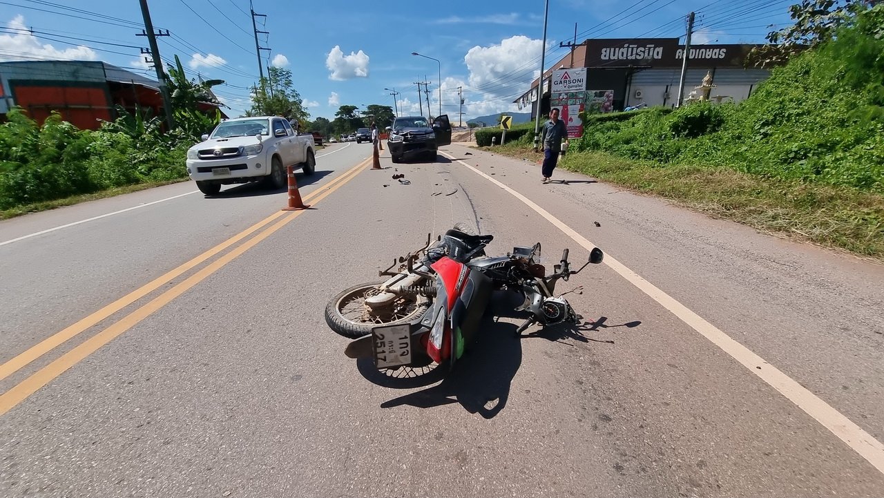 เมื่อเวลา 12.10 น. วันที่ 5 พ.ย.64 พ.ต.ท.บุญชู มีศรี รอง ผกก.(สอบสวน) สภ.ด่านซ้าย จ.เลย แพทย์ รพ.สมเด็จพระยุพราชด่านซ้าย กู้ภัยสว่างคีรีธรรม จุดด่านซ้าย เดินทางไปตรวจที่เกิดเหตุ รถ จยย.ชนประสานงารถกระบะ มีผู้บาดเจ็บสาหัส ถนนด่านซ้าย-โคกงาม เลยโค้งราชดำริ หน้าร้านศักดิ์สิทธิ์การยาง ต.ด่านซ้าย อ.ด่านซ้าย ที่เกิดเหตุพบผู้บาดเจ็บสภาพนอนหงาย ขาขวาและข้อศอกมือขวาผิดรูป อาการสาหัส ชื่อนายอัครพงษ์ อายุ 19 ปี อยู่บ้านขามป้อม ต.ร่องจิก อ.ภูเรือ จ.เลย กู้ภัยฯ ทำการปฐมพยาบาลรีบนำส่ง รพ.สมเด็จพระยุพราชด่านซ้าย ห่างออกไปพบรถ จยย.ฮอนด้าเวฟ สีแดง ทะเบียน 1 กจ 2517 กระบี่ สภาพพังยับเยิน ของผู้บาดเจ็บ และรถกระบะโตโยต้ารีโว้ สีเทา ทะเบียน บษ 7890 เพชรบูรณ์ สภาพหน้ารถขวาพัง กระจกหน้ารถฝั่งผู้โดยสารแตก มีนายสุริยา แดนพรม อายุ 43 ปี อยู่ ต.วังยาว อ.ด่านซ้าย จ.เลย คนขับรถกระบะ ยืนรอพบ จนท.ตร.