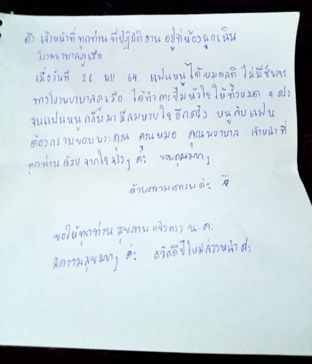 วันที่ 21 ธ.ค.64 โรงพยาบาลภูเรือ จ.เลย ได้มีการโพสต์กล่องพัสดุพร้อมจดหมาย ของญาติผู้ป่วยรายหนึ่งจาก อ.ลำลูกกา จ.ปทุมธานี ส่งถึงโรงพยาบาลภูเรือ สร้างความประทับใจ และรอยยิ้ม โดยมีข้อความว่า “ถึง จนท.ทุกท่าน ที่ปฎิบัติงาน อยู่ที่ห้องฉุกเฉินโรงพยาบาลภูเรือ เมื่อวันที่ 26 พ.ย.64 แฟนหนูได้หมดสติ ไม่มีชีพจร ทางโรงพยาบาลภูเรือ ได้ทำการปั้มหัวใจให้ทั้งหมด 4 ครั้ง จนแฟนหนูกลับมามีลมหายใจอีกครั้ง หนูกับแฟนต้องกราบขอบพระคุณ คุณหมอ คุณพยาบาล เจ้าหน้าที่ทุกท่านด้วย จากใจจริงๆ ค่ะ ขอบคุณมาก ด้วยความเคารพ ขอให้ทุกท่านสุขภาพแข็งแรงนะคะ มีความสุขมากๆ คะ สวัสดีปีใหม่ล่วงหน้าคะ”