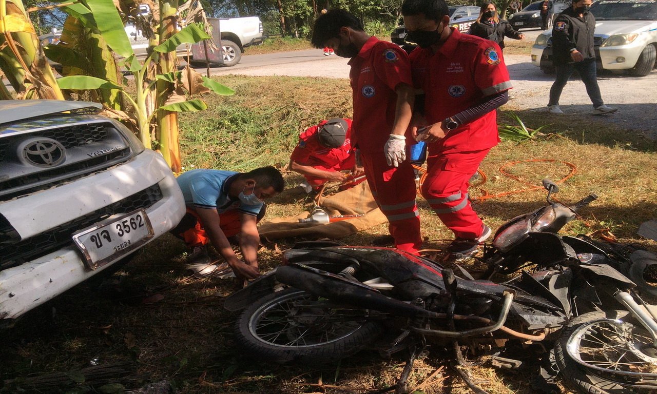 เมื่อเวลา 09.44 น. วันที่ 29 ธ.ค.64 ร.ต.อ.สุพจน์ โพธิ์สุวรรณ รอง สว.(สอบสวน) สภ.ภูกระดึง จ.เลย แพทย์ รพ.ภูกระดึง กู้ภัยภูกระดึง กู้ภัยสว่างคีรีธรรม เดินทางไปตรวจสอบ รถกระบะชนเก๋ง และ จยย. มีผู้บาดเจ็บสาหัส 3 ราย ถูกรถกระบะทับร่าง บริเวณหน้าร้านนมชมพู ถนนราชวิถี ทางเข้าอุทยานแห่งชาติภูกระดึง ต.ภูกระดึง อ.ภูกระดึง ที่เกิดเหตุพบรถกระบะโตโยต้าวีโก้ 4 ประตู สีขาว ทะเบียน ขจ 3562 ระยอง พุ่งชนท้ายรถเก๋งโตโยต้าวีออส สีขาว ทะเบียน กอ 9920 เชียงใหม่ และชนรถ จยย.ฮอนด้าเวฟ สีดำ 1 กฒ 8615 เลย มีผู้บาดเจ็บสาหัส 3 ราย อยู่ใต้ท้องรถกระบะ ชื่อนายณัฐพัฒน์ ผ่องแผ่ว อายุ 15 ปี คนขี่ จยย. นายภัทรพล กำแพงแก้ว อายุ 15 ปี นายไตรภพ พลอยสุขใจ อายุ 15 ปี อาการสาหัส ทั้ง 3 คน กู้ภัยฯ ปฐมพยาบาลเบื้องต้น นำส่ง รพ.ภูกระดึง ส่วนสาเหตุ พงส.เก็บหลักฐานและหากล้องวงจรปิดในที่เกิดเหตุ