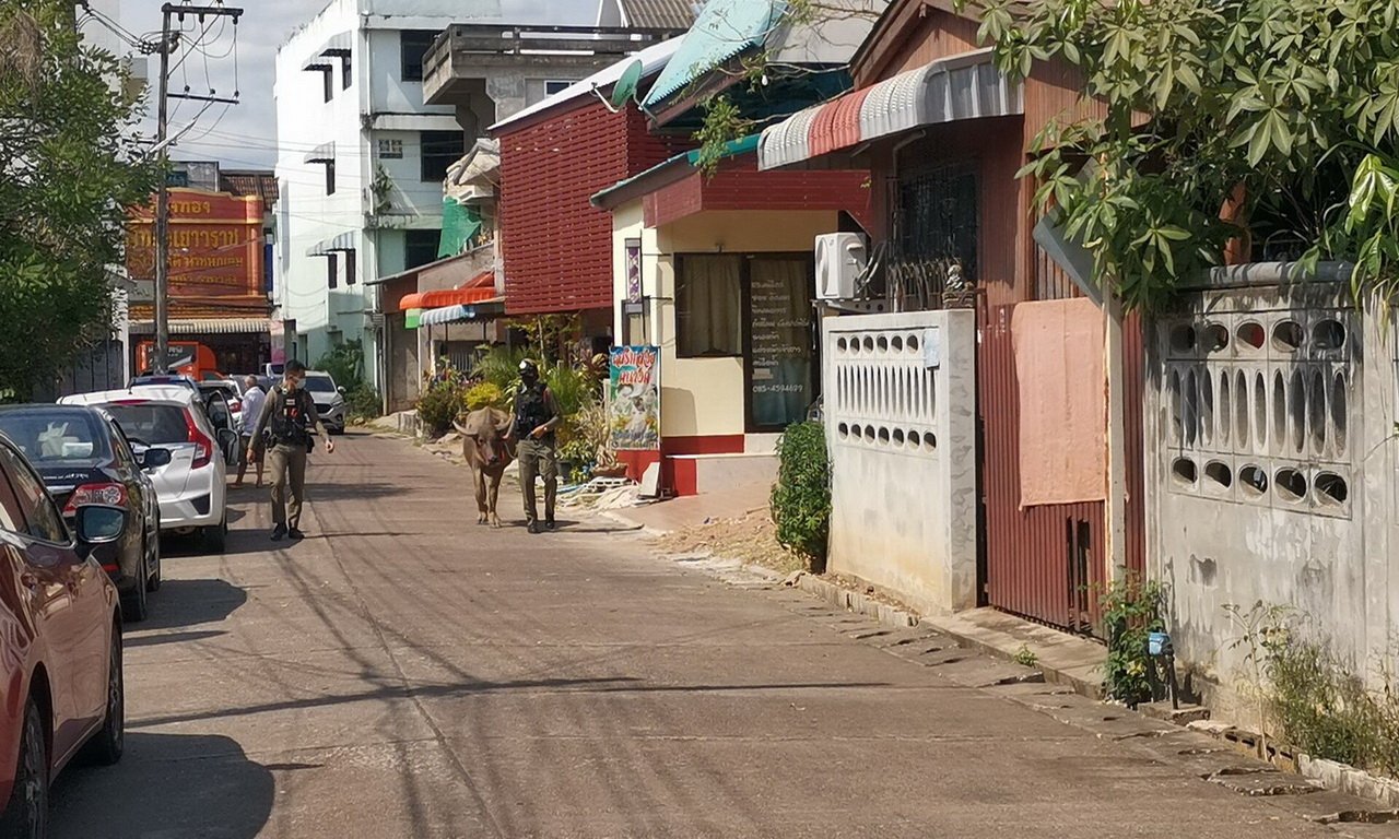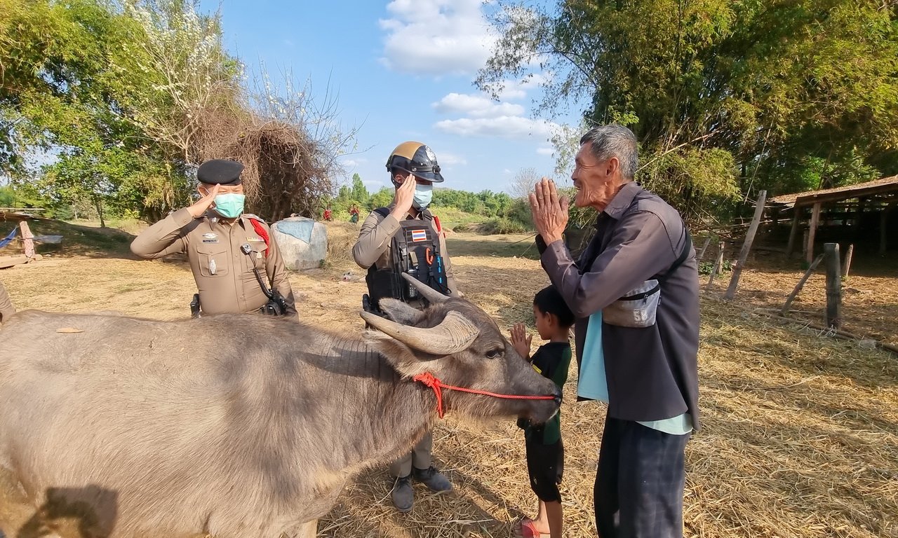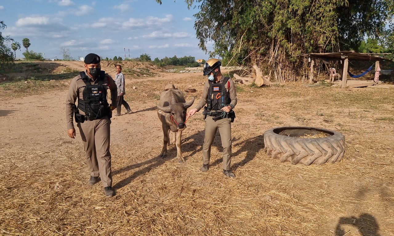 เมื่อเวลา 12.10 น. วันที่ 18 ม.ค.65 ร.ต.อ.อิสเรศ อินทร์ชัยศรี รอง สวป.สภ.วังสะพุง จ.เลย ได้รับแจ้งจากชาวบ้านว่ามีควายหลุดออกมาจากฟาร์มเดินเล่นในตลาดเช้า อ.วังสะพุง จ.เลย เมื่อรับแจ้ง พร้อมด้วย ร.ต.ต.ประภาวิณ พิมสอน รอง สว.(ป) ด.ต.สุระ จรภักดี ส.ต.ท.ศิวกร หนูจันทร์ ส.ต.ต.ศิวพล พุกพิลา ส.ต.ต.พิทักษ์พล สมสีดา นำกำลังสายตรวจออกตรวจสอบที่ตลาดเช้า พบควายเพศผู้ อายุประมาณ 1 ปี เดินเพ่นพ่านในตลาด สร้างความตกใจของชาวบ้าน จึงได้ช่วยกันจับ จากนั้นจูงควายมาที่ สภ.วังสะพุง จนบ้านร้านค้าริมถนนเห็นแปลกใจและส่งยิ้มให้ จนทราบว่าเจ้าควายชื่อไอ้จ่อย ส่วนเจ้าของควายชื่อนายวิไล ประทุมานนท์ อายุ 62 ปี อยู่คอกวัวเลยหลง บ้านปากเป็ง ต.วังสะพุง อ.วังสะพุง ห่างจากโรงพักประมาณ 1 กม. จึงได้นำควายไปส่งถึงที่ มีนายวิไล ประทุมานนท์ เจ้าของควาย เห็นดีใจที่ตำรวจนำความชื่อไอ้จ่อยมาส่งให้