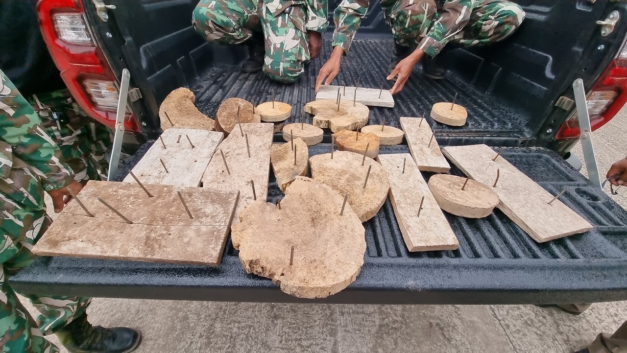 สืบเนื่องจากเมื่อวันที่ 14 ม.ค.65 จนท.หน่วยพิทักษ์ป่าภูหอ เขตรักษาพันธ์สัตว์ป่าภูหลวง อ.ภูเรือ จ.เลย นำกำลังออกตรวจและลาดตระเวน พื้นที่รอยต่อ อ.ภูเรือ-อ.ภูหลวง และพื้นที่ใกล้เคียงในบริเวณป่าภูหอ-ห้วยซำค้อ พื้นที่บ้านสวนปอ ต.แก่งศรีภูมิ อ.ภูหลวง จ.เลย พบกับดักทำด้วยไม้กลมลักษณะคล้ายเขียง บางอันก็เป็นไม้แผ่นสี่เหลี่ยม แต่ไม้ทุกรูปแบบทำการตีตะปูขนาดความยาว 3-5 นิ้ว โดยตีใส่ไม้จนทั่วพื้นที่หน้าตัดไม้ นำไปวางซ่อนพรางด้วยหญ้าแห้ง ไว้บริเวณขอบสระน้ำในบริเวณดังกล่าว จนท.ทราบได้ทันทีว่าเป็นการวางกับดักเพื่อให้ช้างป่าเดินมาเหยียบ และเป็นการเจตนาล่าช้างป่า ชุดสายตรวจจึงได้เก็บกู้กับดักดังกล่าว นับได้จำนวน 70 อัน โดยได้ถ่ายรูปไว้เป็นหลักฐาน จากนั้นได้ทำการสืบสวนจนทราบผู้ต้องสงสัย แต่ยังไม่สามารถเปิดเผยได้ และได้รวบรวมพยานหลักฐาน เพื่อแจ้งความดำเนินคดี
