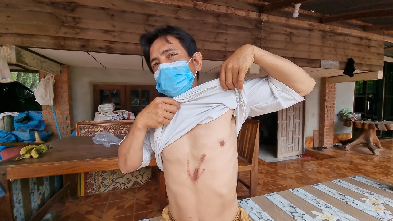 นายธานี หนูยิ้มซ้าย ที่บ้านห้วยตาด ต.โคกงาม อ.ด่านซ้าย ผู้บาดเจ็บ เล่าว่า ตนเองเพิ่งออกมาจากโรงพยาบาล โดยเมื่อวานไปทำไร่มันสำปะหลัง มีควายเพศผู้เขายาวประมาณศอก มาจากไหนไม่รู้ขวิดเข้าที่ลำตัว และสีข้างซ้ายหลายครั้ง จนร่างลอยกระแทกพื้นได้รับบาดเจ็บ แฟนและเพื่อนบ้านช่วยกันไล่จนหนีเข้าป่าไป โชคดีที่ซี่โครงไม่หัก หมอให้กลับมารักษาตัวที่บ้าน