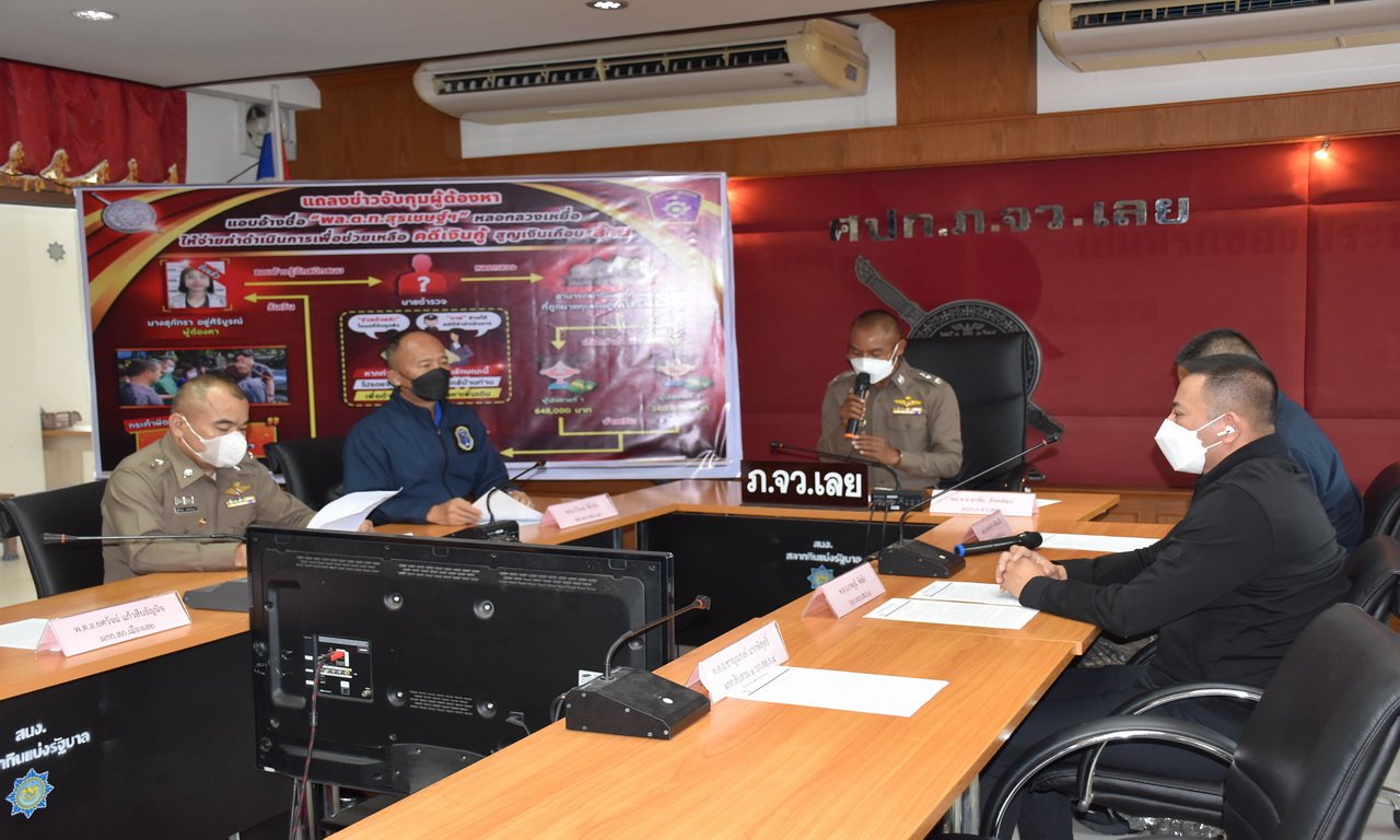 เมื่อเวลา 11.00 น.วันที่ 29 ก.ค.65 ณ ศูนย์ปฎิบัติการตำรวจภูธรจังหวัดเลย (ศปก.) ชั้น 2 ตำรวจภูธรจังหวัดเลย อ.เมืองเลย จ.เลย พล.ต.ต.สุรชัย สังขพัฒน์ ผบก ภ.จว.เลย เป็นประธานเปิดแถลงข่าวกรณี พล.ต.ท.สุรเชษฐ์ หักพาล ผช.ผบ.ตร.สั่งรวบผู้อ้างชื่ือ ผช.ผบ.ตร.หลอกผู้เสียหายหลายราย จะช่วยเอาทรัพย์สินที่ดินคืนจากกลุ่มนายทุนเงินกู้