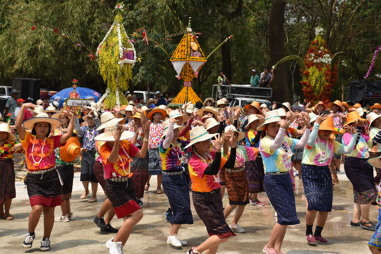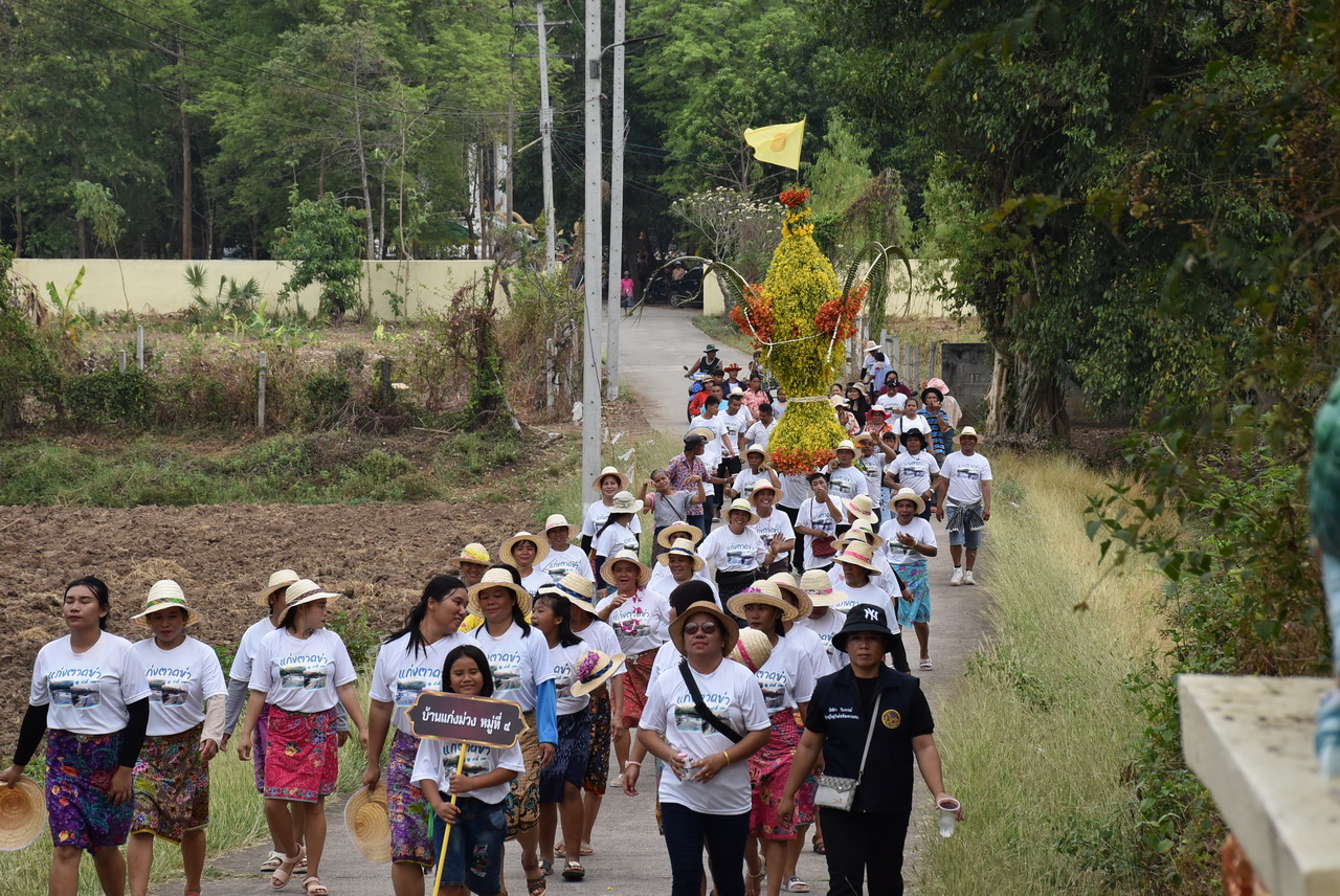 ชาวบ้านบ้านอาฮี ต.อาฮี อ.ท่าลี่ จ.เลย จะร่วมตัวกันทำต้นดอกไม้เพื่อบูชาต่อพระรัตนตรัย สืบทอดประเพณีมายาวนาน ต้นดอกไม้บ้านอาฮีจะมีขนาดไม่ใหญ่มากนัก รูปทรงจะเหมือนกับตัวขุนในหมากรุกไทย ความสูงก็ประมาณไม่เกิน2 เมตร 4 คนแบก แต่จะประดับตกแต่งดอกไม้แบบเต็มๆสวยงาม ดอกไม้ที่นำมาตกแต่งก็จะหาเอาจากที่มีอยู่ในหมู่บ้าน ไม่ว่าจะเป็นดอกคูน ว่าน 4 ทิศ ชาวบ้านจะไปร่วมตัวกันที่วัดเมืองตูมธรรมาราม ต้นดอกไม้ทั้งหมดประมาณปีละ 20 ตัน เมื่อได้เวลาประมาณไม่เกินบ่ายโมงก็จะมีพิธีเปิดการเต้นโยกตามจังหวะดนตรี จากนั้นประมาณ บ่าย 2 โมง ขบวนแห่ต้นดอกไม้ก็จะเริ่มเคลื่อนขบวนไปตามถนนผ่านเขตชุมชนที่มีชาวบ้านคนชื่นชมความสวยงามของต้นดอกไม้ตลอดสองข้างทางเป็นระยะทาง 3 กิโลเมตร ก่อนจะเข้าไปที่วัดศิริมงคล และจะนำต้นดอกไม้ทุกต้นมาตั้งเรียงกัน เพื่อกล่าวคำถวายต่อพระรัตนตรัยพร้อมๆ กันเป็นอันเสร็จพิธี