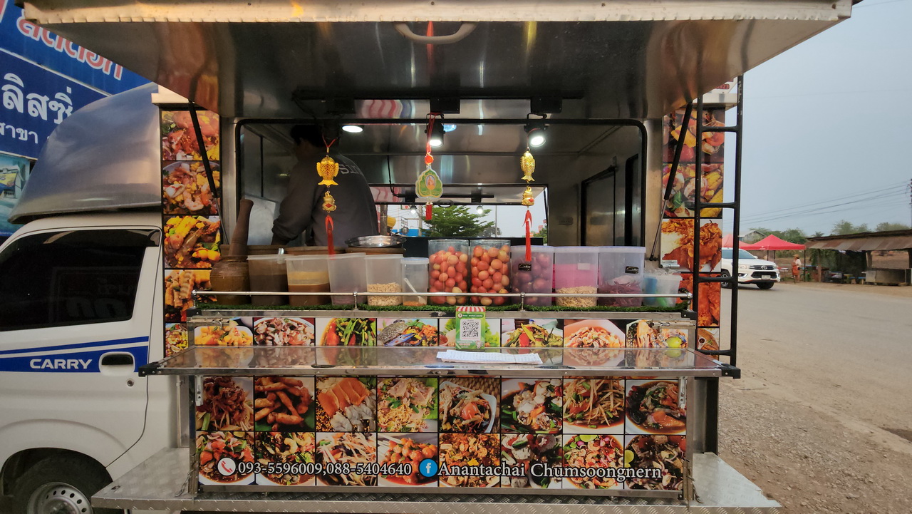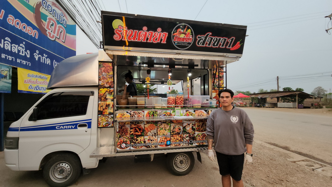 นายอนันย์ชัย ชุมสูงเนิน อายุ 27 ปี เล่าว่า แต่ก่อนทำงานอยู่กับพ่อที่บ้าน แต่ใจรักการทำอาหาร จึงตัดสินใจเอาเงินที่เก็บออมมาไปซื้อรถฟู้ดทรัค ตบแต่งหมดไป 830,000 บาท มาตระเวนขายส้มตำและยำทุกชนิด เช้าถึงเย็นตระเวนขายไปทั่วอำเภอผาขาว จ.เลย โดยที่ลูกค้าเพียงโทรมาเท่านั้น เราจะวิ่งไปหาลูกค้าทันที ลูกค้าก็พอใจที่ไม่ต้องวิ่งไปซื้อ ส่วนตอนเย็นจะมาตั้งขายที่ตลาดอยู่ริมถนน บริเวณเทศบาลตำบลโนนปอแดง ที่ร้านจะขายส้มตำ และอาหารยำทุกชนิด ยำทะเลก็มี ราคาอยู่ที่ 50-150 บาท แล้วแต่ชนิดยำ ส่วนของทะเลจะสั่งมาวันต่อวัน ปลาร้าก็ทำเอง สะอาด หอม วันหนึ่งมีรายได้ 6,000-7,000 บาท สร้างรายได้เลี้ยงครอบครัว ร้านค้าหรือหน่วยงานจะเหมาไปออกงานก็รับ สนใจสอบถามได้ที่เบอร์ 064-1585484