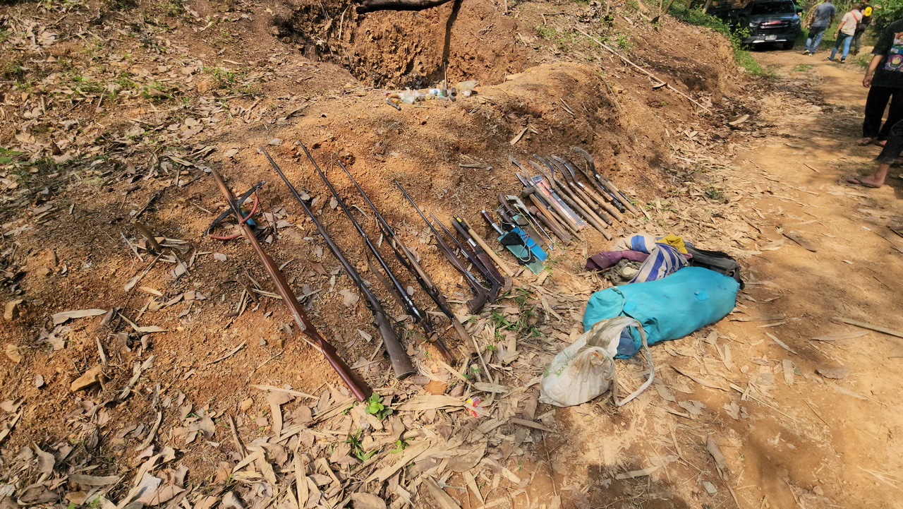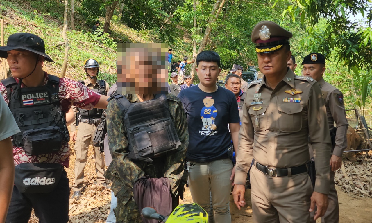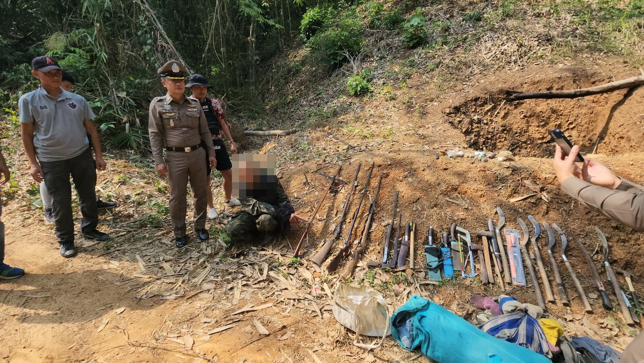 ตร.ชุดสืบสวน ได้ติดตามตัวจนสามารถจับกุมตัวได้ นำมาค้นกระท่อมห่างจากที่เกิดเหตุ 50 เมตร พบปืนลูกซองยาว 1 กระบอก ปืนหน้าไม้ 1 อัน ปืนแก๊ปยาว 4 กระบอก ปืนแก๊ปสั้น 1 กระบอก มีดปลายแหลม มีดพร้า กว่า 10 เล่ม ฆ้อน เลื่อย ซุกซ่อนอยู่ในกระท่อม จึงได้ตรวจยึด