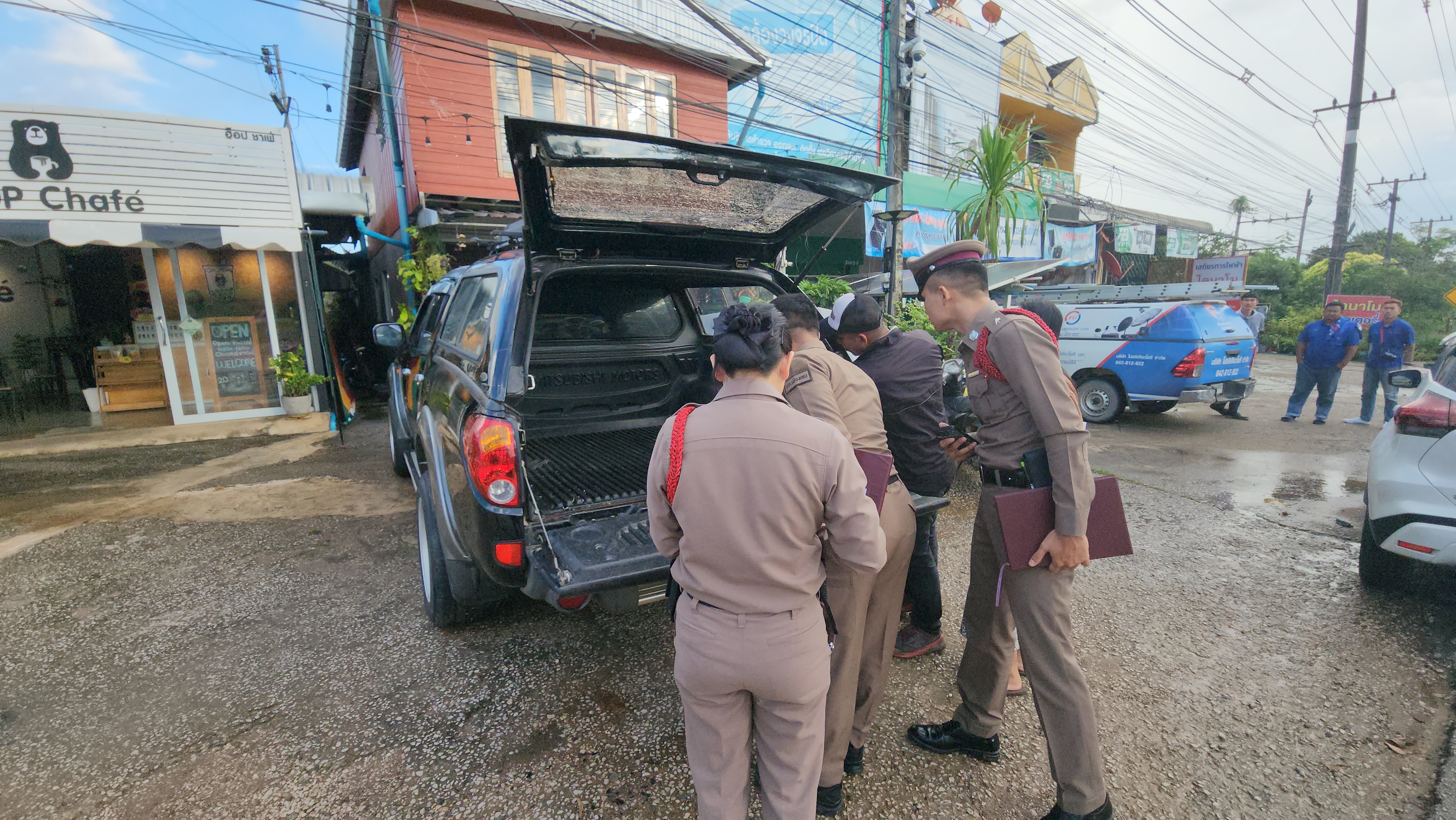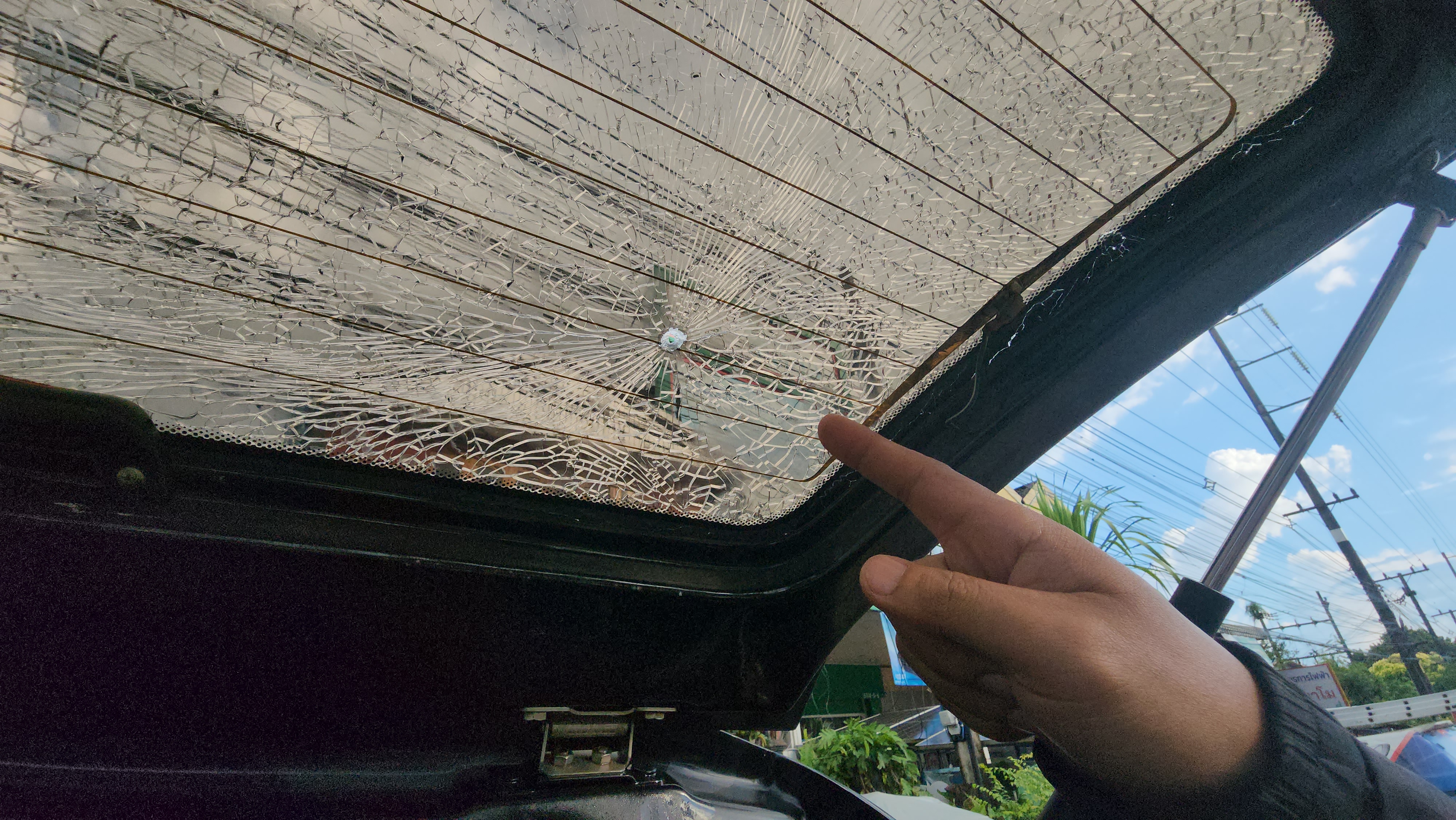 เจ้าของรถ เล่าว่า กำลังขนของขึ้นรถกระบะ พบกระจกหลังกระบะแตกร้าวทั้งบาน คิดว่าจอดรถตากแดดนานจนกระจกแตก เมื่อมามองดูที่กระจกพบมีรูกระสุนปืน และเมื่อช่วงเวลาประมาณบ่ายโมง หลานได้ยินเสียงปืนดังขึ้น 5-6 นัด คาดว่ามาจากคนที่ยิงปืนขึ้นฟ้าภายในงานศพวัดใกล้ๆ ที่บ้าน โชคดีที่ไม่ไปโดนรถที่กำลังขับผ่านไปมา ไม่อย่างงั้นคงมีคนเจ็บหรือเสียชีวิต