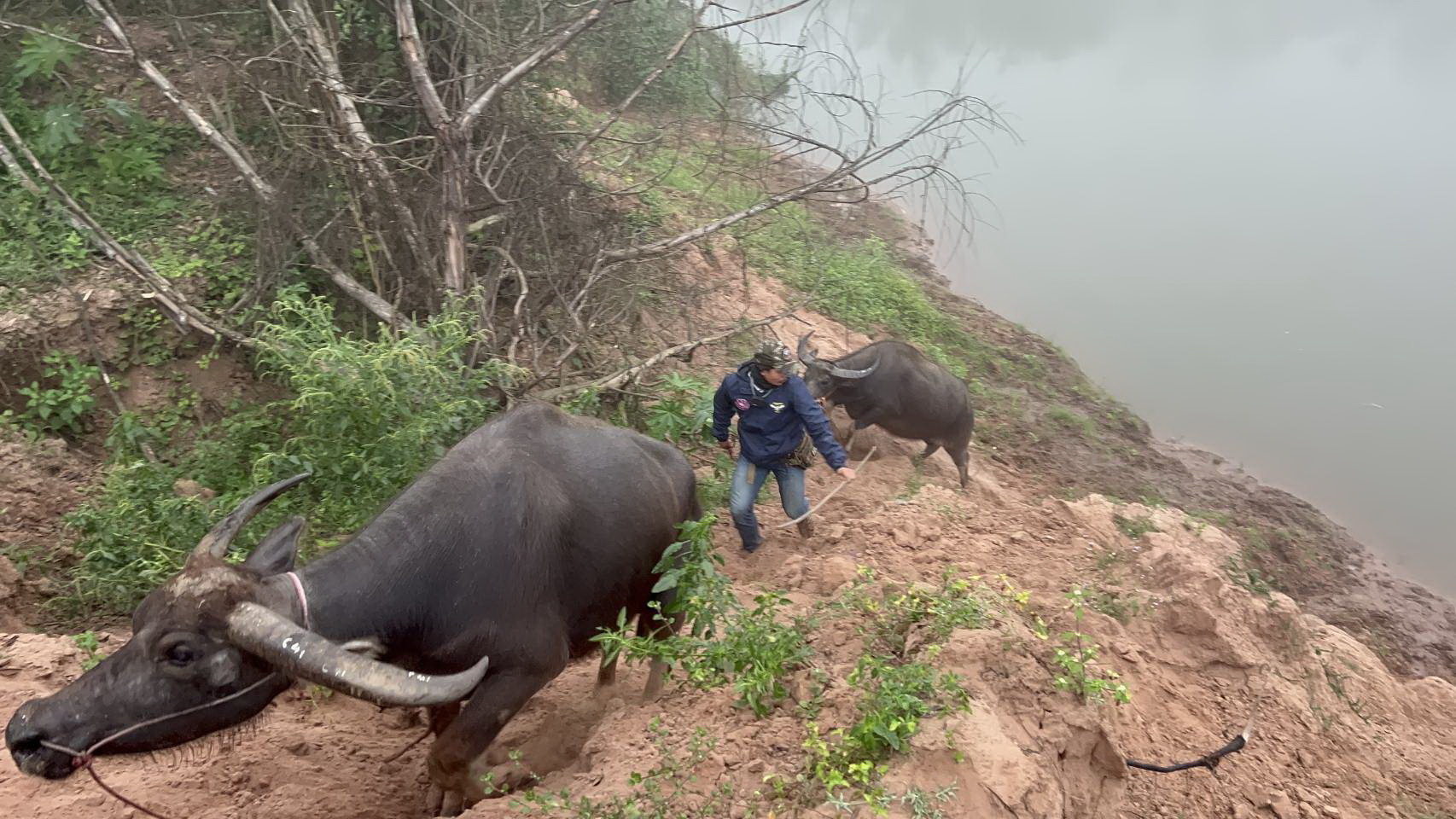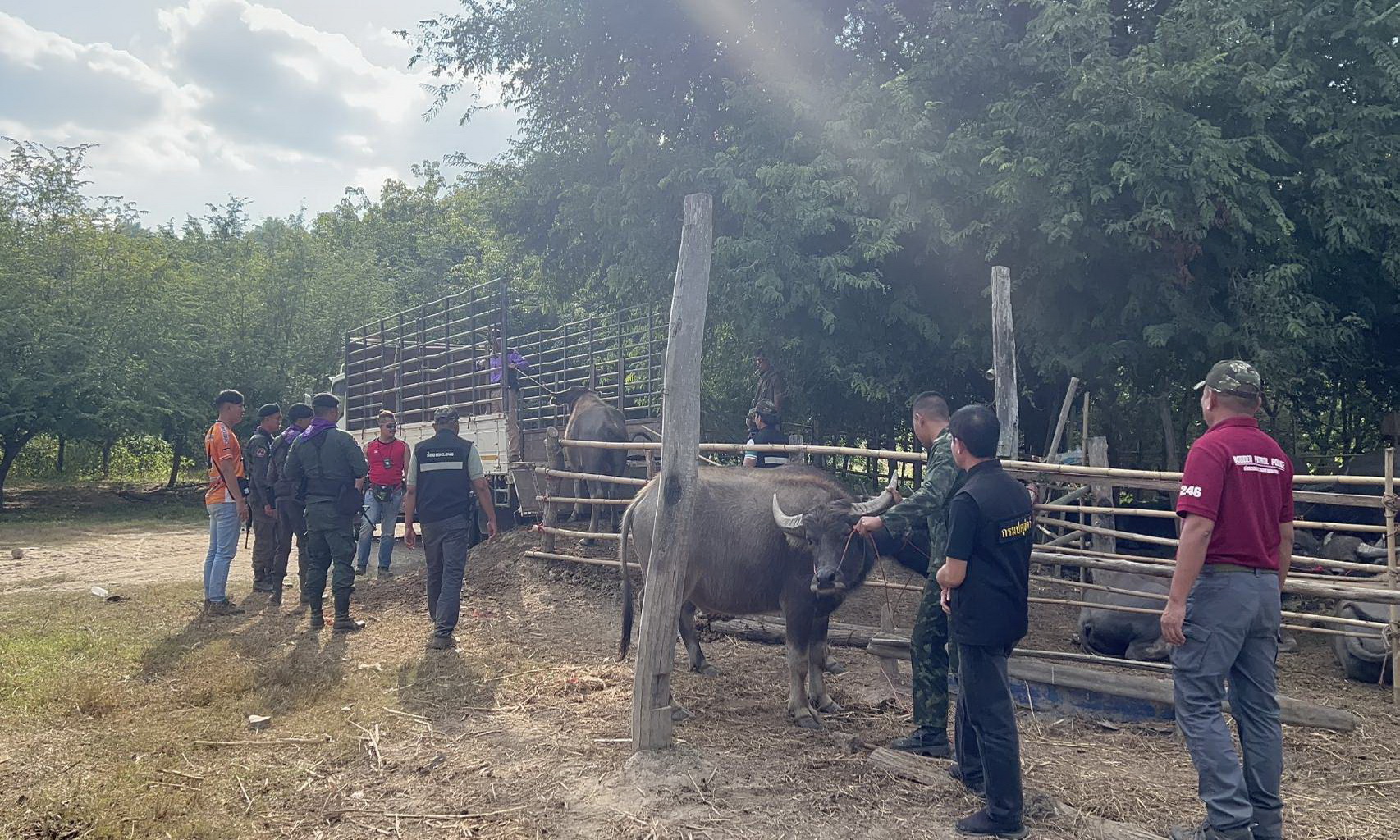 วันที่ 19 ธ.ค.67 อำนวยการโดยว่าที่ พ.ต.อ.กรณ์ ไชยเสือ ผกก.ตชด.24 พ.ต.ท.บุญเลิศ วิเศษชาติ รอง ผกก.ตชด.24 ว่าที่ พ.ต.ต.สุเมธ พลเยี่ยม ผบ.ร้อย ตชด.246 สั่งการให้ ร.ต.อ.ผจญศักดิ์ เทพรังสฤษฎิ์ หน.ชปข.ฯ ร.ต.ท.มณฑล ภักมี หน.ชฝต.14 พร้อมหน่วยความมั่นคงในพื้นที่ อ.เชียงคาน ร่วมกันตรวจจะมีการนำกระบือจำนวนมากข้ามแม่น้ำเหืองไปยังประเทศเพื่อนบ้าน สปป.ลาว ที่ริมแม่น้ำเหืองท้องที่บ้านนาจาน ต.ปากตม อ.เชียงคาน จ.เลย เมื่อไปถึงพบกลุ่มชายจำนวนหนึ่ง กำลังต้อนกระบือข้ามแม่น้ำเหืองไปยังฝั่ง สปป.ลาว จึงได้แสดงตัวขอตรวจค้น แต่กลุ่มชายเมื่อเห็น จนท.ได้ว่ายน้ำหลบหนีไป