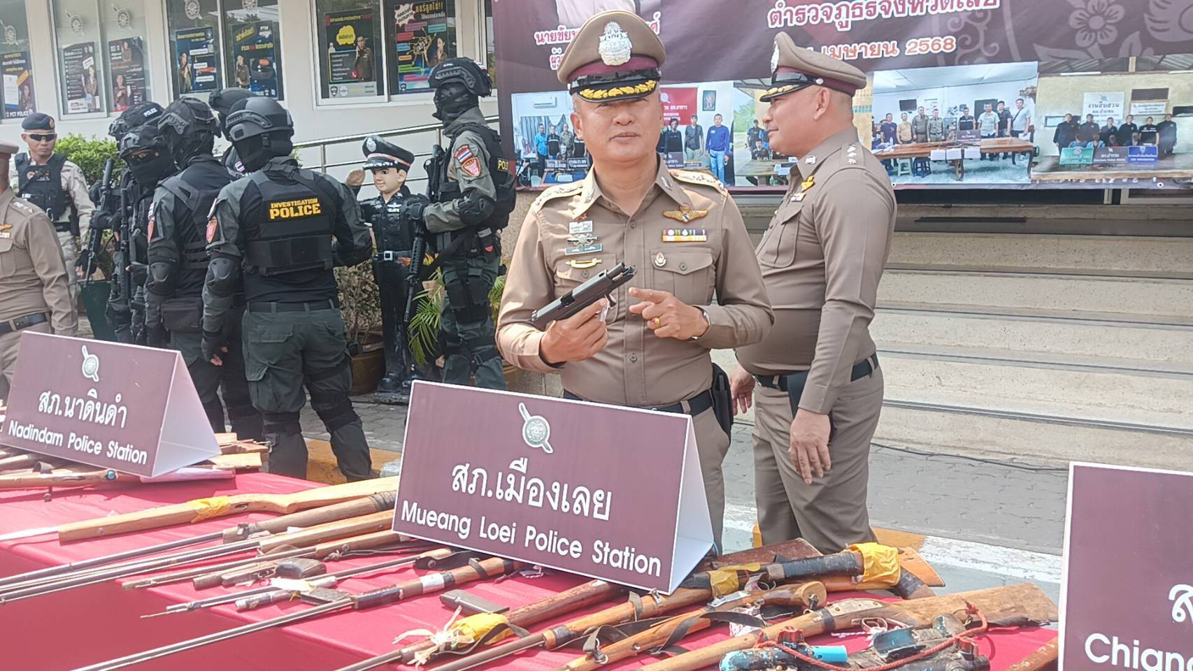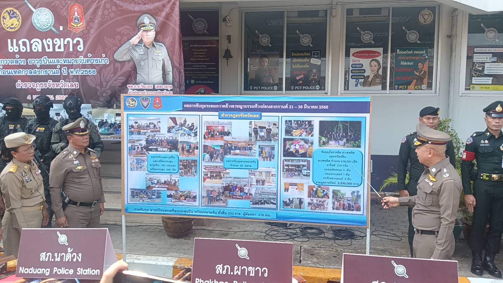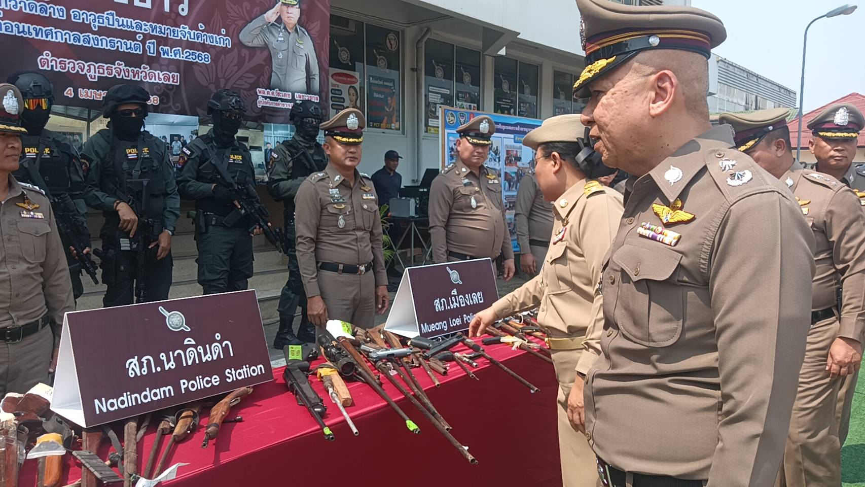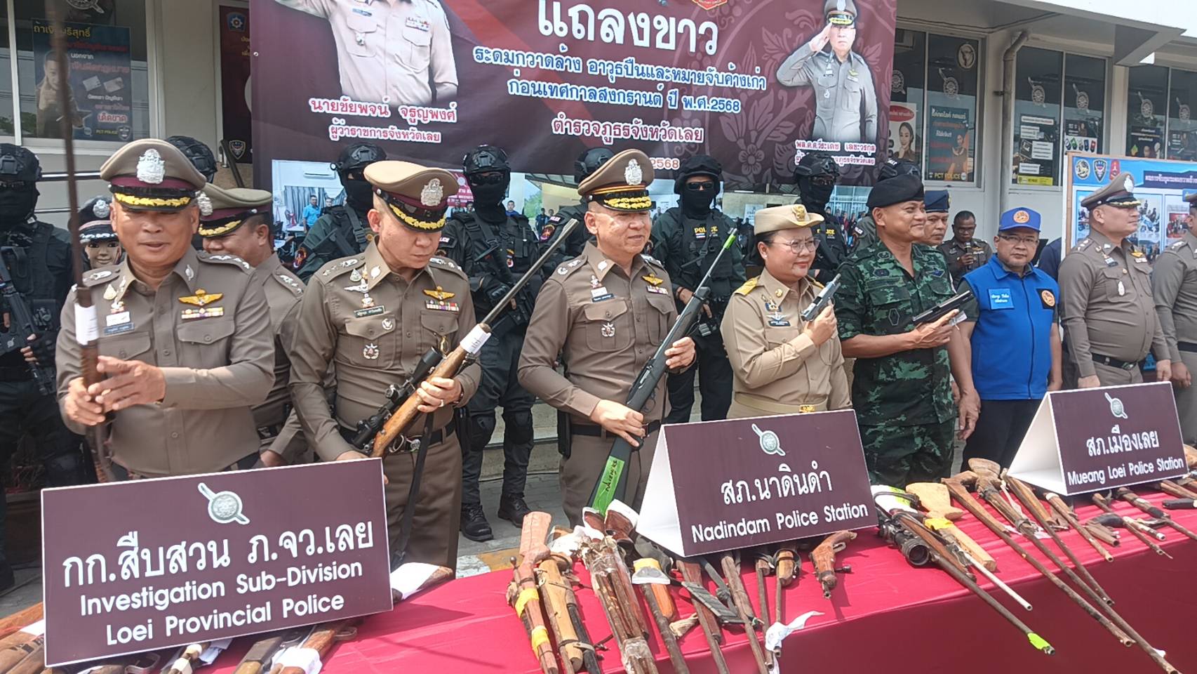 เมื่อเวลา 10.00 น. วันที่ 4 เมษายน 68 ที่หน้า สภ.เมืองเลย จ.เลย พลตำรวจตรี วีระเดช เลขะวรกุล ผบก.ภ.จว.เลย พ.ต.อ.ณัฐกฤต คำวิเศษชัย รอง ผบก.ภ.จว.เลย นางสาวภูมารินทร์ คงเพียรธรรม ปลัดจังหวัดเลย พร้อมด้วยฝ่ายปกครอง ทหาร ร่วมแลงข่าวผลการระดมกวาดล้างอาวุธปืนและหมายจับก่อนสงกรานต์ ตามที่สำนักงานตำรวจแห่งชาติ ให้มีการระดมกวาดล้างและหมายจับในช่วงก่อนเทศกาลสงกรานต์ ปี 68 ซึ้งเป็นช่วงวันหยุดเทศกาลสงกรานต์ ที่มีวันหยุดติดต่อหลายวัน ประชาชนส่วนใหญ่เดินทางกลับภูมิลำเนา เพื่อพบครอบครัวครัวและพักผ่อน ทั้งประชาชนบางส่วน นิยมที่จะออกเดินทางไปท่องเที่ยวตามงานกิจกรรม สถานบันเทิง สถานบริการต่างๆ ทำให้มีปัจจัยเสี่ยงต่อการเกิดเหตุอาชญากรรมอาจทำให้เกิดความสูญเสียต่อชีวิตและทรัพย์สินของประชาชน ในพื้นที่จังหวัดเลย