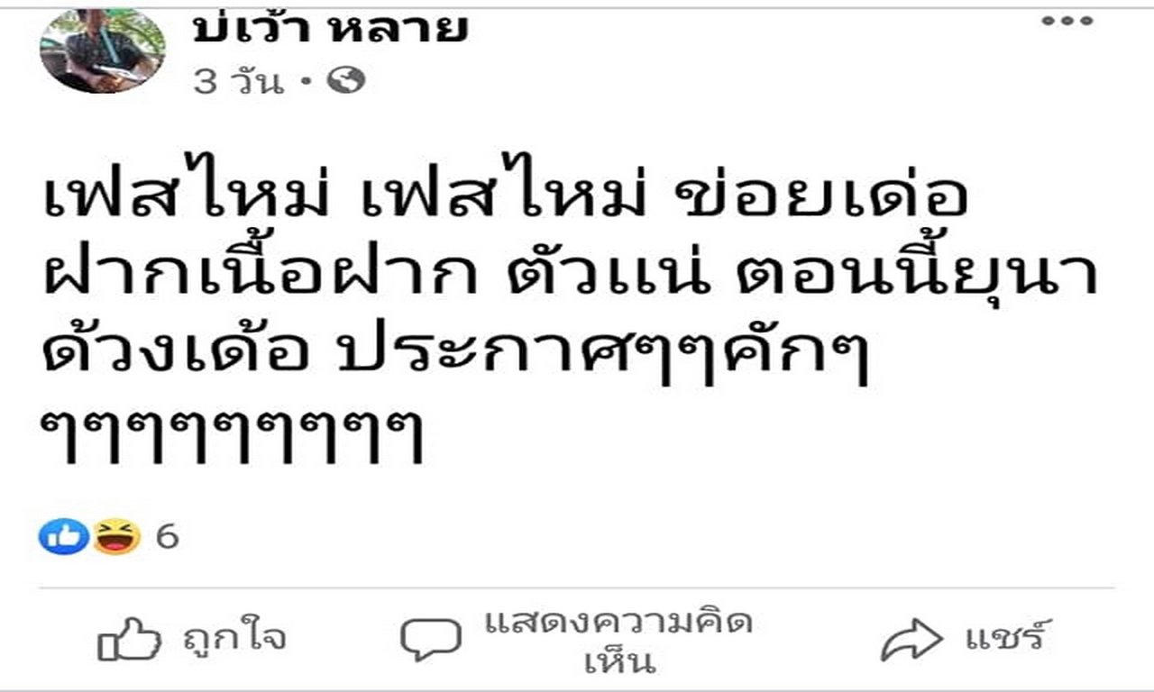 วันที่ 7 พ.ค.64 กลุ่มไลน์ จ.เลย ได้มีการแชร์โพสต์ เฟสบุ๊กชื่อ “บ่เว้า หลาย” เป็นชายอายุประมาณ 45-55 ปี คาดว่าอาศัยอยู่ในพื้นที่ อ.นาด้วง จ.เลย โพสต์ภาพยาบ้าและอุปกรณ์การเสพยาบ้า และโพสต์ข้อความ “เฟสไหม่ เฟสไหม่ ข่อยเด่อ ฝากเนื้อฝากตัวแน่ ตอนนี้อยู่นาด้วงเด้อ ประกาศๆๆ คักๆๆๆๆๆๆๆๆๆๆ” อย่างไม่เกรงกลัวกฎหมาย ส่วนชายคนดังกล่าวทำงานรับขนส่งระหว่างไทย-ลาว ของบริษัทฯ แห่งหนึ่ง จนมีคนนำมาแชร์เป็นจำนวนมาก อยากให้ตำรวจรีบดำเนินการตรวจสอบและจับกุมชายดังกล่าวมาดำเนินคดี จากการตรวจสอบไปยังเฟสบุ๊กชื่อ “บ่เว้า หลาย” ไม่พบคาดว่าปิดเฟสไปแล้ว