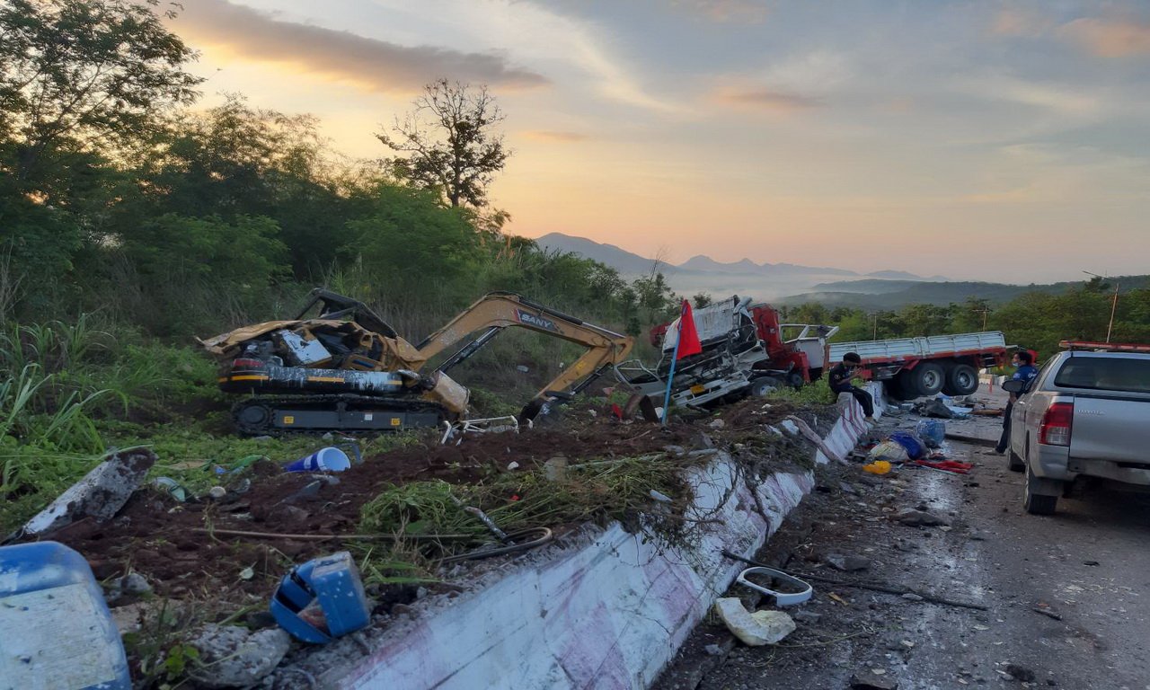 รถ 10 ล้อ บรรทุกรถแบคโฮ ลงเขาโค้ง 100 ศพ หม้อลมเบรกหมด เอาไม่อยู่พุ่งชนแท่งแบรีเออร์ คนขับเจ็บ ผู้โดยสารเสียชีวิต