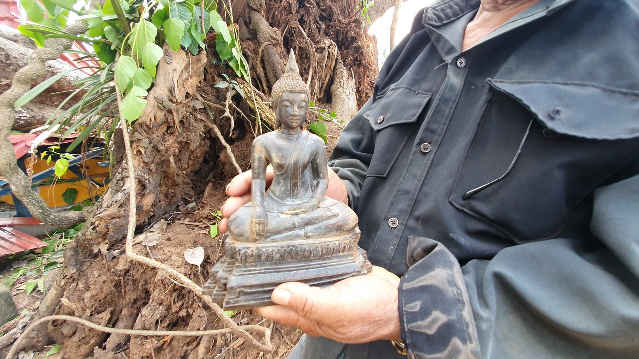 วันนี้เมื่อเวลา 14.00 น. วันที่ 15 พ.ค.64 ผู้สื่อข่าวได้ลงพื้นที่ไปยังวัดศรีสะอาด พบภายในวัดมี จนท.กองพันทหารราบที่ 1 กรมทหารราบที่ 8 ค่ายศรีสองรัก จ.เลย กว่า 20 คน กำลังช่วยกันตัดกิ่งต้นโพธิ์ที่หักโค่น และต้นอื่นๆ ภายในวัด ส่วนบริเวณต้นโพธิ์ที่หักโค่น พบศาลปู่ได้รับความเสียหาย และโพรงกลางลำต้นโพธิ์ พบพระพุทธรูปโลหะปางมารวิชัย สูงประมาณ 20 ซ.ม. หน้าตักกว้าง 15 ซ.ม. อยู่ในโพรงกลางลำต้น สูงจากโคนต้น 3 เมตร บริเวณบนฐานพระแกะสลักข้อความว่า “พระพุทธรูปประธานในวิหาร อ.นครไทย” ชาวบ้านได้นำออกมาจากโพรงต้นโพธิ์ สอบถามไปยังเจ้าอาวาสฯ ปฏิเสธให้ข้อมูลบอกว่าไม่อยากเดือดร้อน
